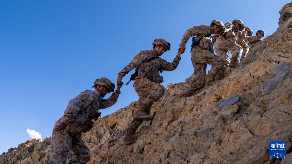 西藏阿里軍分區(qū)普爾楚邊防連秋迪儉革拉哨所巡邏官兵在巡邏途中爬越陡峭山坡(6月29日攝)。新華社發(fā)(戴學(xué)武 攝)