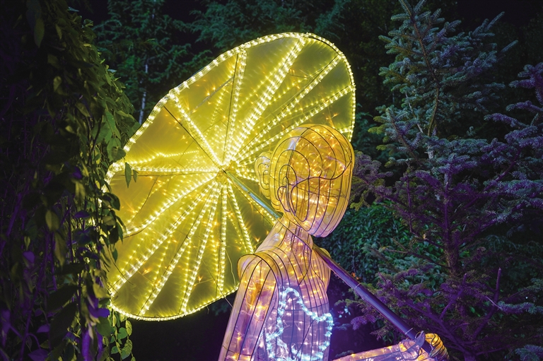 走進(jìn)燈會現(xiàn)場,仿佛置身于一個夢幻般的世界,各式各樣的花燈錯落有致地分布在公園各個角落,令人目不暇接。宗角祿康公園的走廊里、草坪上,一盞盞精美的燈組在夜色的映襯下顯得更加璀璨奪目,展示出江南煙雨、小橋流水、青磚黛瓦、梅瓶明珠、桃花仙鶴、油傘折扇、上元燈彩等富有江蘇特色的美景雅韻,讓人似乎來到江南水鄉(xiāng),親身感受那一份寧靜與美好。當(dāng)然,此次燈會最引人矚目的便是“蘇拉一家親”大型燈組,運用拉薩經(jīng)典配色搭建飄逸的彩帶雙翼,再搭配拉薩的吉祥物牦牛和江蘇的吉祥物麋鹿,充分表達(dá)了“蘇拉一家親,攜手向未來”的寓意。