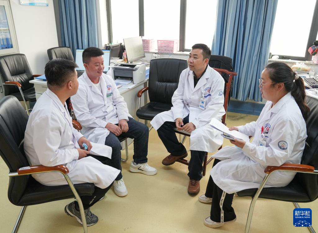 在日喀則市人民醫(yī)院,胡健衛(wèi)(右二)與徒弟段穎騫(左一)、張武(左二)、潘亞茹在辦公室內開會(7月8日攝)。新華社記者 丁汀 攝