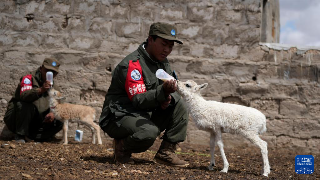 尼瑪縣措羅木管護站野保員在給藏羚羊幼崽喂奶(7月13日攝)。新華社發(fā)(旦增攝)
