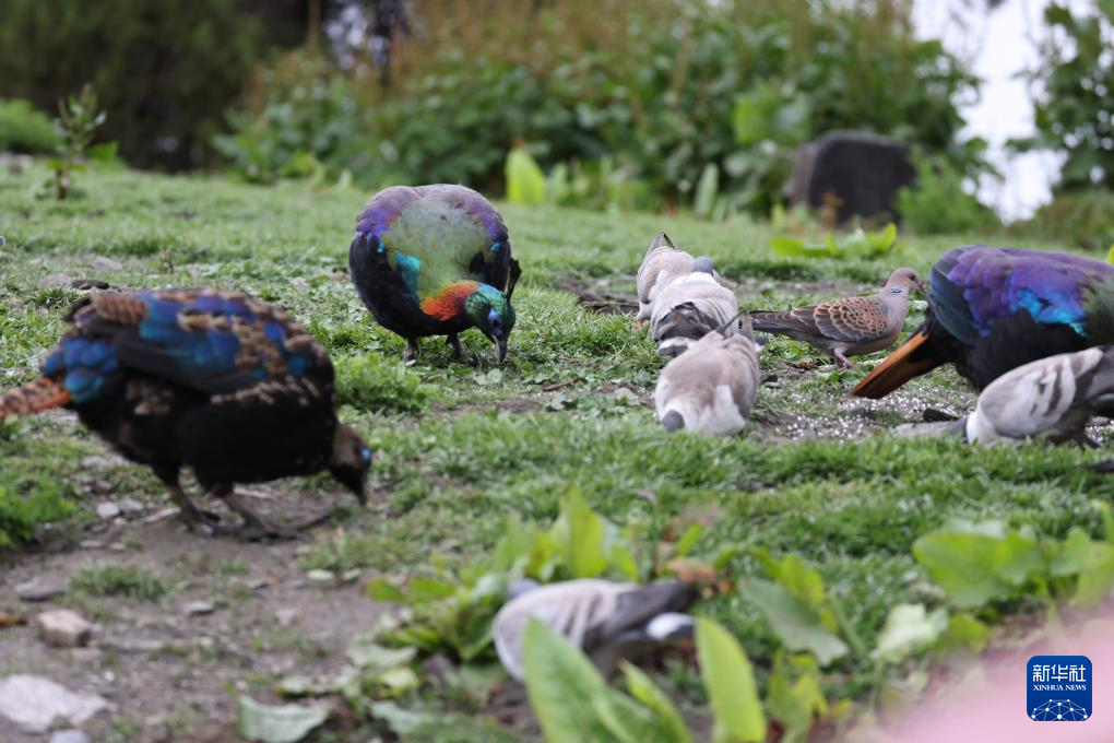 這是7月23日拍攝的亞成體雄性棕尾虹雉(左一)與成鳥一起覓食的場景。新華社記者 姜帆 攝