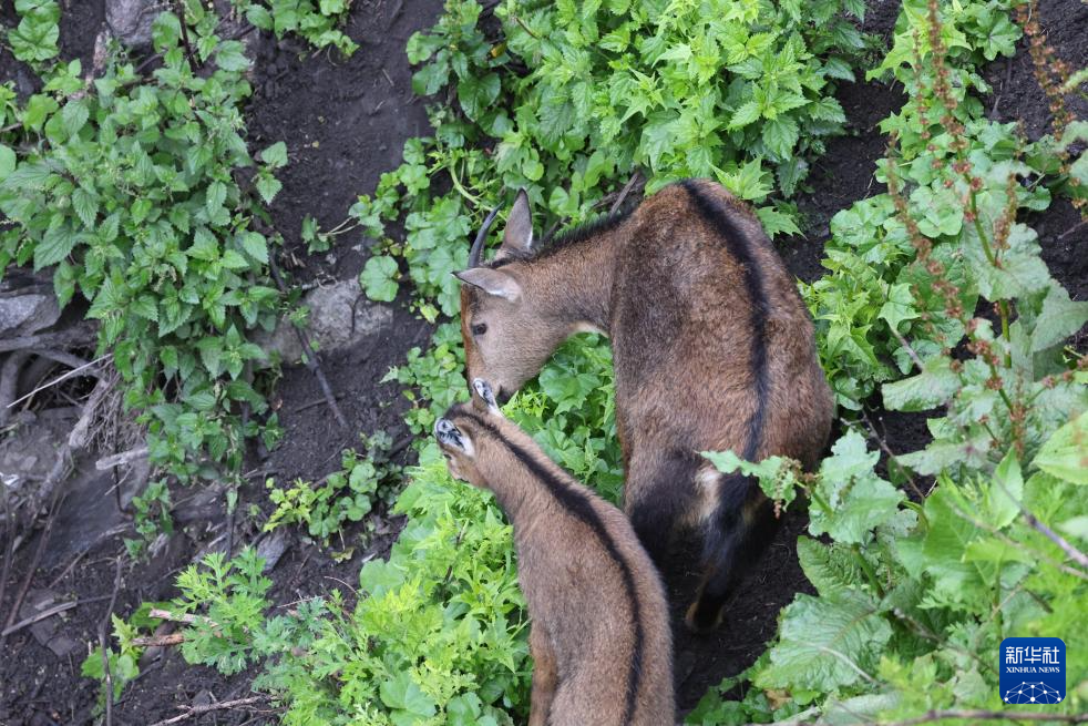 7月23日,雌性喜馬拉雅斑羚帶領(lǐng)幼崽覓食。新華社記者 姜帆 攝