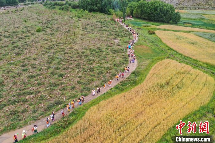 7月24日,西藏拉薩市曲水縣南木村迎來了一年一度的“望果節(jié)”。當(dāng)日,村民們盛裝打扮背上經(jīng)文,圍繞全村田園轉(zhuǎn)上一圈,轉(zhuǎn)到每一塊農(nóng)田前都要煨桑祈求風(fēng)調(diào)雨順、五谷豐登。“望果節(jié)”民俗已有1500多年的歷史,是國家級非物質(zhì)文化遺產(chǎn)。圖為曲水縣南木村村民身著盛裝背上經(jīng)文繞田。(無人機照片)中新社記者 貢嘎來松 攝