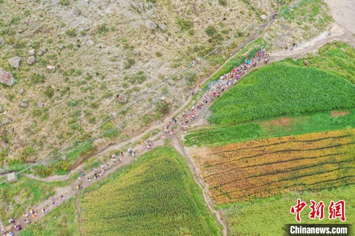7月24日,西藏拉薩市曲水縣南木村迎來了一年一度的“望果節(jié)”。當(dāng)日,村民們盛裝打扮背上經(jīng)文,圍繞全村田園轉(zhuǎn)上一圈,轉(zhuǎn)到每一塊農(nóng)田前都要煨桑祈求風(fēng)調(diào)雨順、五谷豐登?!巴?jié)”民俗已有1500多年的歷史,是國家級非物質(zhì)文化遺產(chǎn)。圖為曲水縣南木村村民身著盛裝背上經(jīng)文繞田。(無人機照片)中新社記者 貢嘎來松 攝