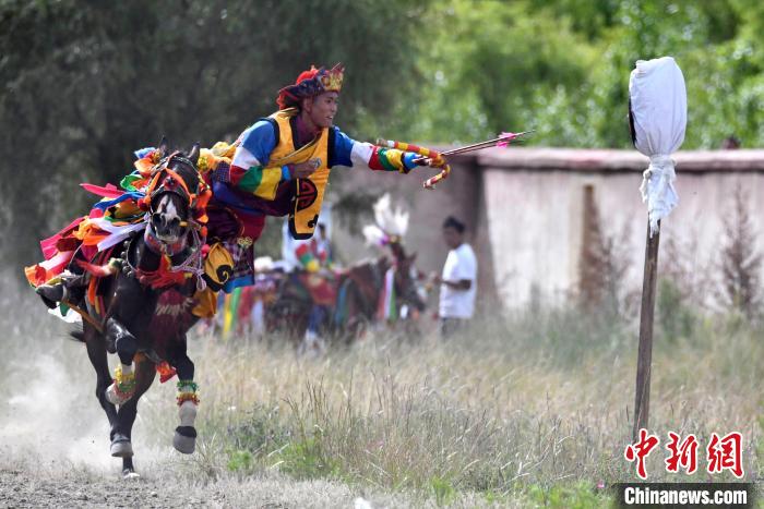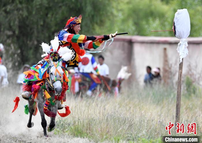 7月27日,西藏拉薩市桑達(dá)村迎來“望果節(jié)”,村民們舉行賽馬活動(dòng)慶祝?!巴?jié)”是西藏傳統(tǒng)的豐收節(jié),具體日期隨各地莊稼成熟的時(shí)間而變化。“望果節(jié)”期間,按照習(xí)俗,各地都會(huì)舉辦賽馬比賽。圖為騎手進(jìn)行馬上射擊表演。中新社記者 李林 攝