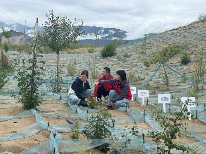 中國(guó)科學(xué)院成都山地災(zāi)害與環(huán)境研究所研究員周萍帶領(lǐng)研究生在西藏扎囊縣沙化土地生態(tài)治理綜合示范區(qū)開展沙地試驗(yàn)樣方植被生長(zhǎng)狀況監(jiān)測(cè)。新華社記者 顧天成 攝