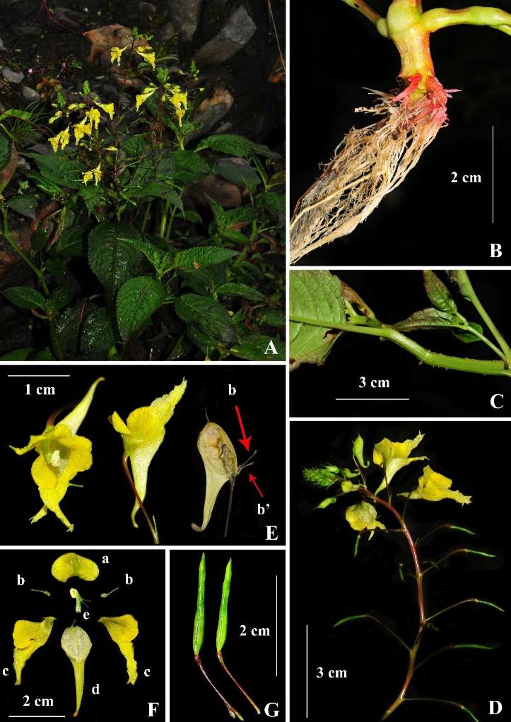2022年,胡光萬研究員團(tuán)隊在西藏隆子縣進(jìn)行野外科考時發(fā)現(xiàn)一種獨特的鳳仙花,后經(jīng)形態(tài)比對和分子系統(tǒng)學(xué)分析,確定其為新物種,并將其命名為隆子鳳仙花。隆子鳳仙花與輻射鳳仙花在形態(tài)上最為接近,但隆子鳳仙花的莖、葉、葉柄和花梗上均被柔毛覆蓋,輻射鳳仙花全株無柔毛,兩者區(qū)別明顯。