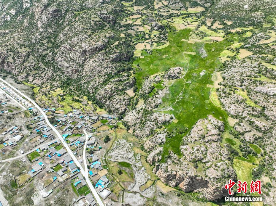 圖為三色湖旁邊的普玉村。(無人機(jī)照片)中新社記者 貢嘎來松 攝