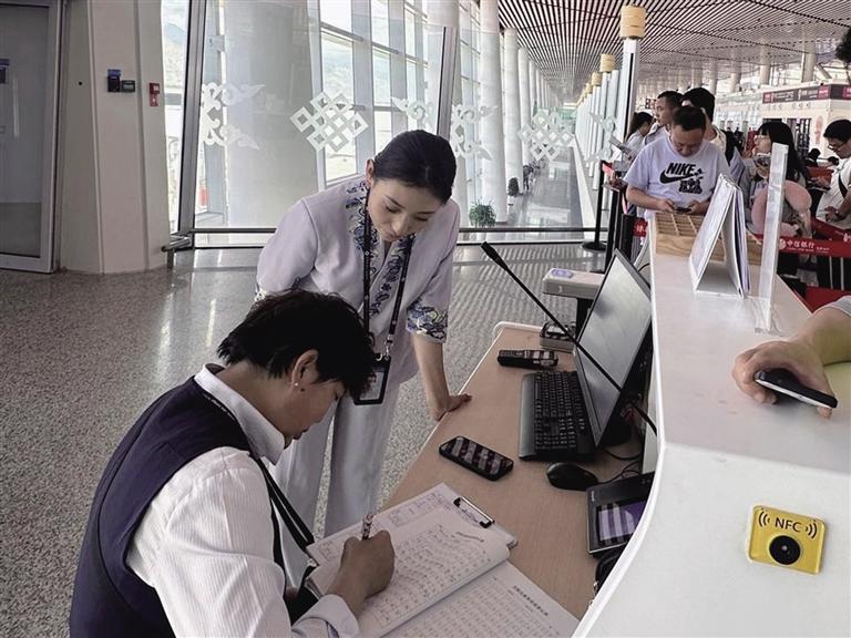 達(dá)娃曲珍在為機(jī)場(chǎng)旅客解答問(wèn)題。