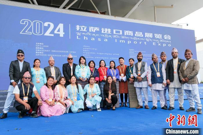 8月4日,來(lái)自尼泊爾和不丹的參展商在拉薩進(jìn)口商品展覽會(huì)開(kāi)幕式現(xiàn)場(chǎng)合影留念。中新社記者 江飛波 攝