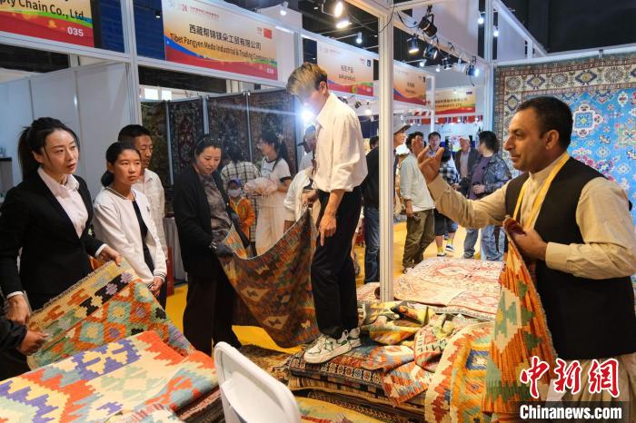 來(lái)自阿富汗喀布爾的商人阿明扎伊·穆罕默德·賈(Aminzai Mohammad Jan)主要銷(xiāo)售阿富汗毛毯等手工藝品,這是他第二次進(jìn)藏展銷(xiāo)?,F(xiàn)場(chǎng),阿明扎伊·穆罕默德·賈十分忙碌,不斷為顧客挑選合適的款式和花色,顧客砍價(jià)時(shí),他便掏出手機(jī)播放毛毯的制作過(guò)程。他說(shuō),期待這次銷(xiāo)量更好。