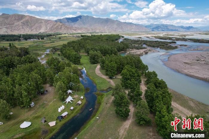 8月11日,人們?cè)诶_市林周縣神秘樹林搭帳篷“過林卡”。(航拍畫面)中新社記者 江飛波 攝