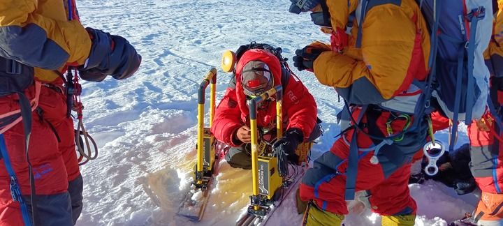 科考隊員用雷達測厚儀,在海拔8201米的卓奧友峰峰頂測量冰雪厚度(2023年10月1日攝)。 新華社發(fā)