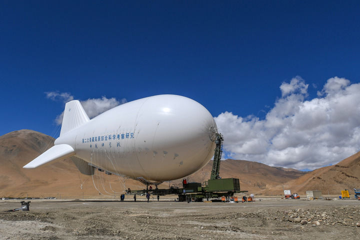 完成充氣后的“極目一號”Ⅲ型浮空艇在中科院珠峰站附近等待升空(2022年5月12日攝)。新華社記者 姜帆 攝