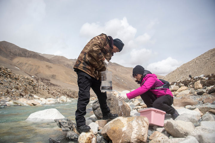 在東絨布冰川區(qū)域,科研人員在進行微生物指標水樣采集(2022年4月30日攝)。 新華社記者 旦增尼瑪曲珠 攝