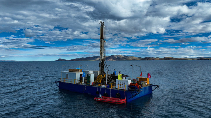 2024年7月11日拍攝的納木錯水上鉆探平臺(無人機照片)。 新華社記者 晉美多吉 攝