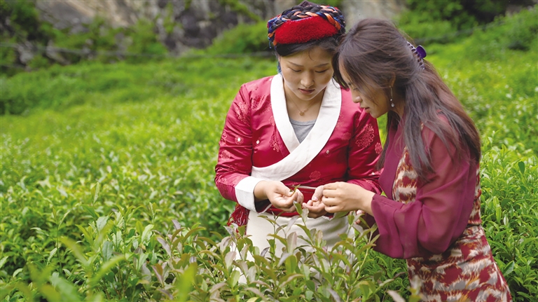從貢日門巴民族鄉(xiāng)開車去勒門巴民族鄉(xiāng)的路上,沿途的茶園風景如畫,尤其是到了采茶季節(jié),整個茶園洋溢著一片繁忙而和諧的景象。身著門巴族服飾的達瓦拉珍,腰間輕掛小巧的竹籃,在翠綠的茶樹間穿梭,手指輕盈地跳躍,一片片鮮嫩的綠芽便落入籃中。在她身后是勒門巴民族鄉(xiāng)茶葉農(nóng)牧民專業(yè)合作社茶園,遠遠望去茶樹依山傍水,在肥沃的土地上生根發(fā)芽。