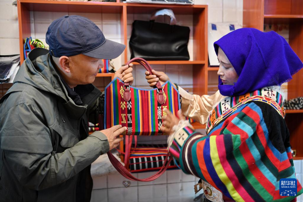 一名來(lái)自上海的游客(左)在安多托尕爾倉(cāng)游牧產(chǎn)業(yè)有限責(zé)任公司展廳挑選產(chǎn)品(8月24日攝)。新華社記者 張汝鋒 攝