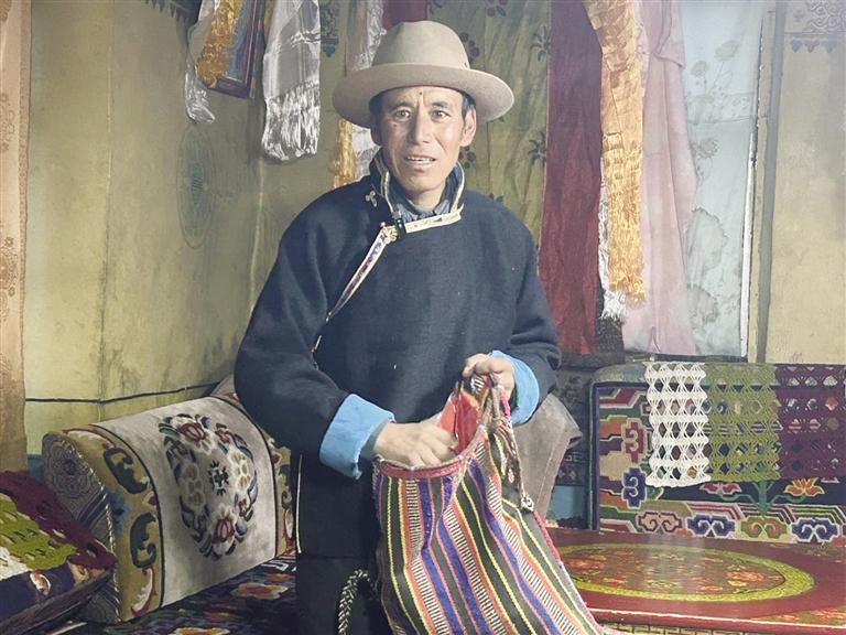 放牧巡邊途中的經(jīng)歷,格桑覺(jué)得只是日常的事情,并沒(méi)有什么值得講述的。不過(guò),他也有特別珍視的東西。格桑特意走進(jìn)另一間屋子,捧出一個(gè)略顯舊色的布袋。他小心打開(kāi)袋子,里面是他珍藏的一面面國(guó)旗。