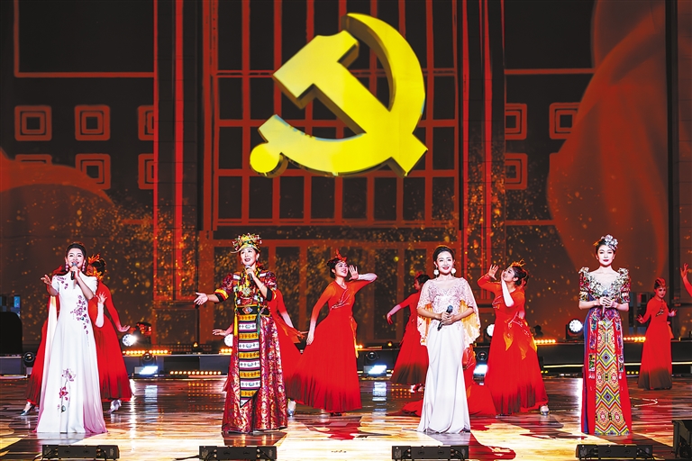 湖南、湖北、安徽三省和中糧集團對口支援山南以來,一批又一批援藏干部人才把山南當(dāng)作第二故鄉(xiāng),與各族人民結(jié)下了跨越山海的深情厚誼。短片《只為你唱的歌》,展示援藏工作者背后的故事和家屬日常生活中的酸甜苦辣。情境合唱《追風(fēng)趕月的人》,是一場為所有援藏工作者精心設(shè)計的特別演出,他們的家屬共同帶來了一首溫情之歌,送出了家屬們對援藏工作者的堅定支持和無盡的愛。女子群舞《格桑芙蓉并蒂開》,展現(xiàn)了湖南、山南兩地人民心手相牽的美好畫面?!俺礁杞o黨聽,我把黨來比母親……”山南市三小格?;ê铣獔F孩子們的聲音直抵人心,隨后湖南、湖北、安徽和山南的歌手們共同唱響《唱支山歌給黨聽》。