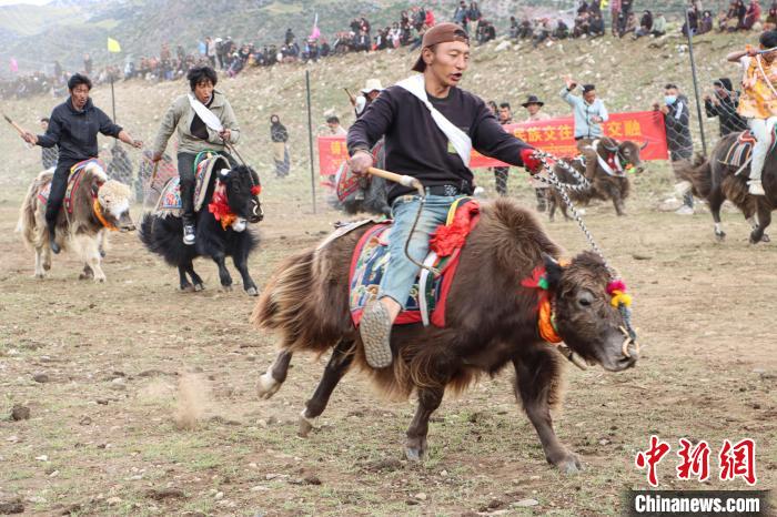 賽牦牛活動現(xiàn)場,牧民將自家的牦牛精心打扮,信心滿滿地走上起跑線,一聲令響,眾騎手驅牛疾馳。現(xiàn)場呼聲陣陣,高潮迭起,為每一頭疾馳的牦牛加油歡呼。