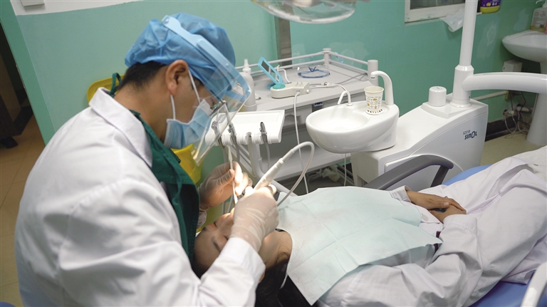 天津市第十批援藏干部、昌都市藏醫(yī)院口腔科副主任醫(yī)師杜斌正在對(duì)患者開展口腔治療。