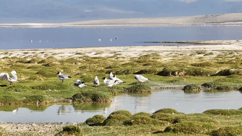 在扎日南木錯(cuò)湖西北處的淡水淺灘區(qū)生長(zhǎng)著茂密的水草和藻類,形成適合鳥(niǎo)類棲息的生態(tài)濕地。