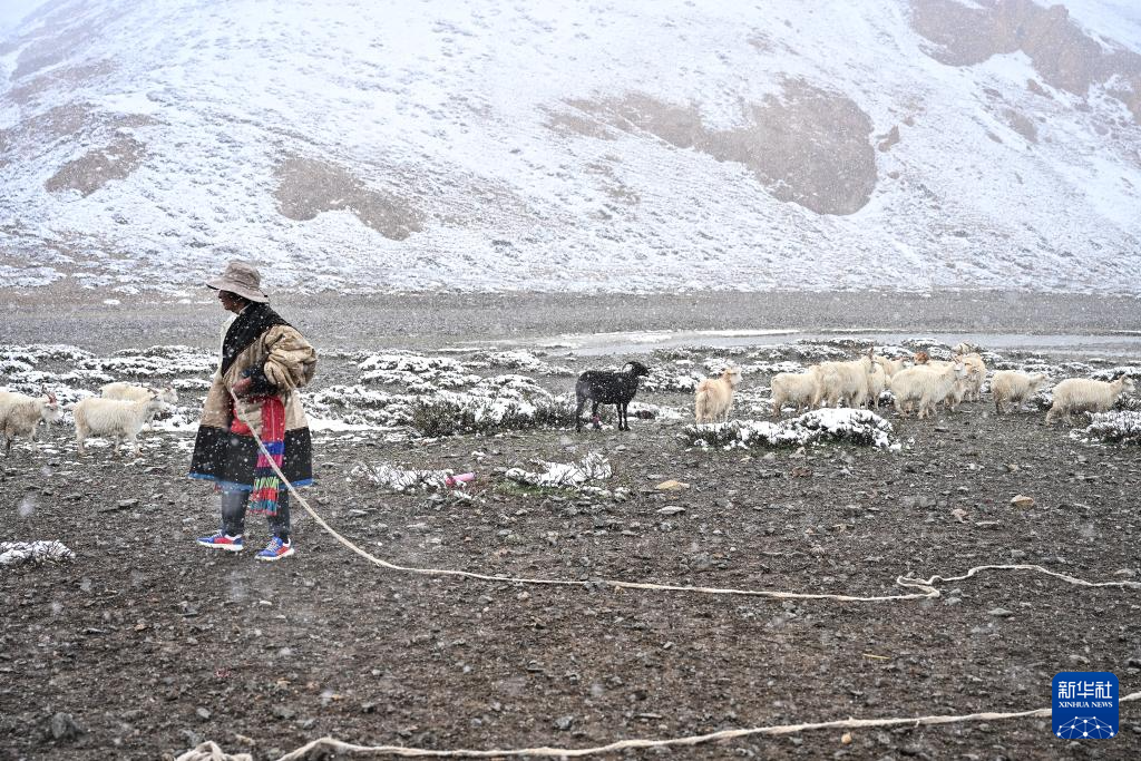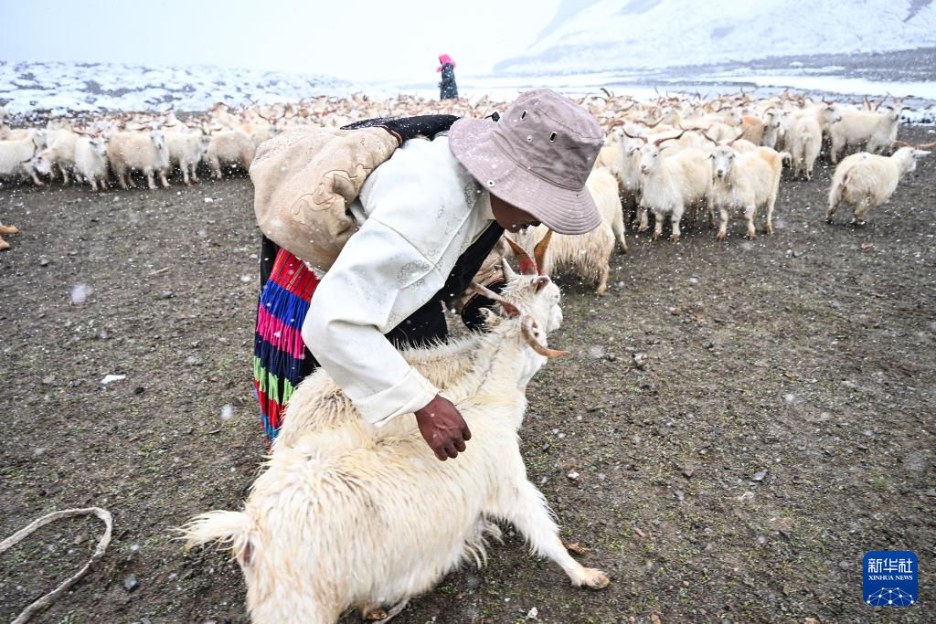 9月13日,在日土縣龍門卡村白絨山羊擴繁場,飼養(yǎng)員收攏白絨山羊,準備給它們擠奶。新華社記者 孫瑞博 攝