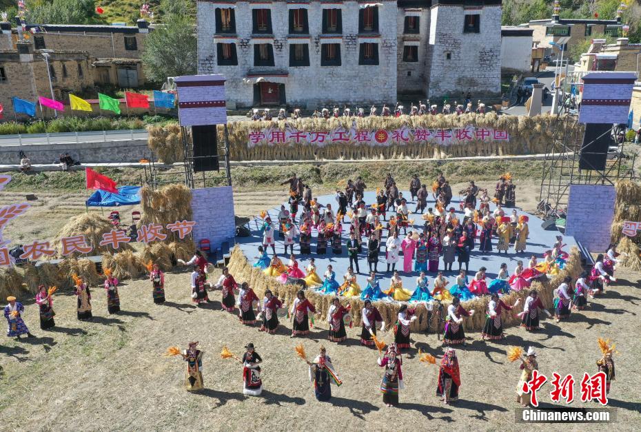 9月22日,2024年西藏“中國農(nóng)民豐收節(jié)”慶?;顒釉谏侥鲜协偨Y(jié)縣拉玉鄉(xiāng)強(qiáng)吉村舉行。活動以“學(xué)用‘千萬工程’禮贊豐收中國”為主題,由西藏各地(市)民間演出隊為大家獻(xiàn)上一場具有地域特色、體現(xiàn)農(nóng)牧民豐收喜悅的歌舞盛宴。圖為演出現(xiàn)場。(無人機(jī)照片)