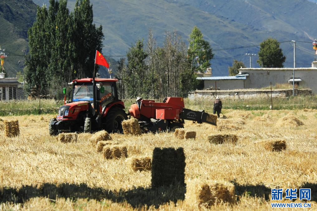 9月19日,墨竹工卡縣村民在進行機械化收割。新華網(wǎng)發(fā) 益果攝