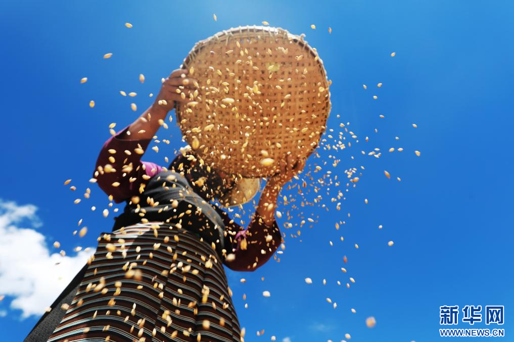 9月19日,村民手持篩子來回晃動,黃色的青稞不斷從篩子中掉落下來。新華網(wǎng)發(fā) 洛克攝