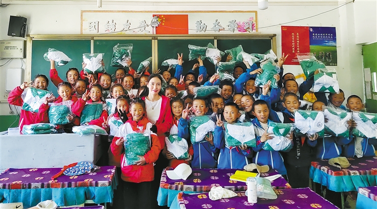 2014年至今,日喀則市南木林縣黨員扎西拉姆積極投身慈善事業(yè),用無私奉獻(xiàn)詮釋著鄰里守望相助和民族團(tuán)結(jié)的真諦。圖為扎西拉姆(中)與受助孩子合影。