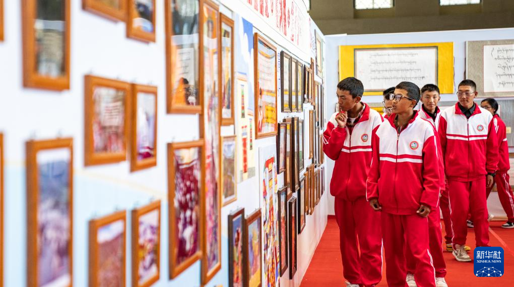 學(xué)生在西藏首屆中小學(xué)生藝術(shù)展演活動獲獎(jiǎng)作品展廳內(nèi)參觀(9月25日攝)。新華社記者 丁增尼達(dá) 攝