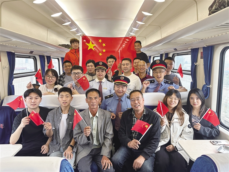 列車(chē)員與旅客合影慶祝國(guó)慶節(jié)。圖由周悅翔 楊寶森提供