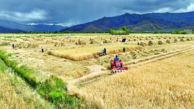 西藏日喀則市白朗縣巴扎鄉(xiāng)近年推廣“藏青3000”等青稞新品種和機械化種植,圖為農(nóng)民在收獲青稞。新華社發(fā)