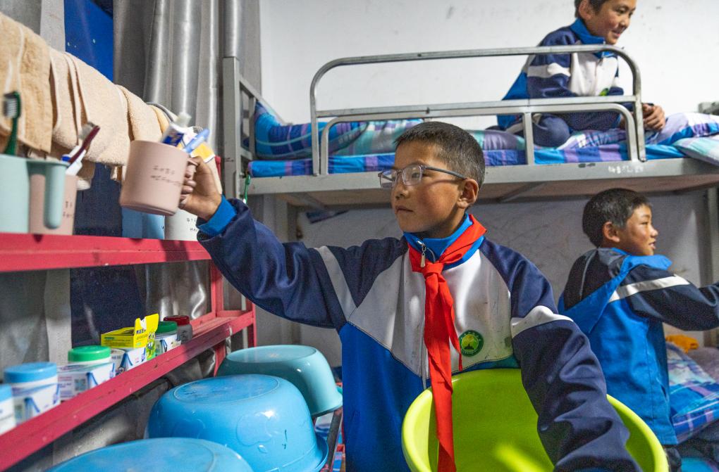 今年10歲的貢喬熱旦上五年級,他在班里的成績一直名列前茅。性格開朗、喜歡運動的他,時不時和班里的同學(xué)開個小玩笑。這所學(xué)校的大部分學(xué)生選擇寄宿制學(xué)習(xí),學(xué)校實行“10+4”工作日教學(xué)模式,即上課10天、休息4天,這樣方便父母接送孩子,也有利于孩子們從小培養(yǎng)自理生活能力。