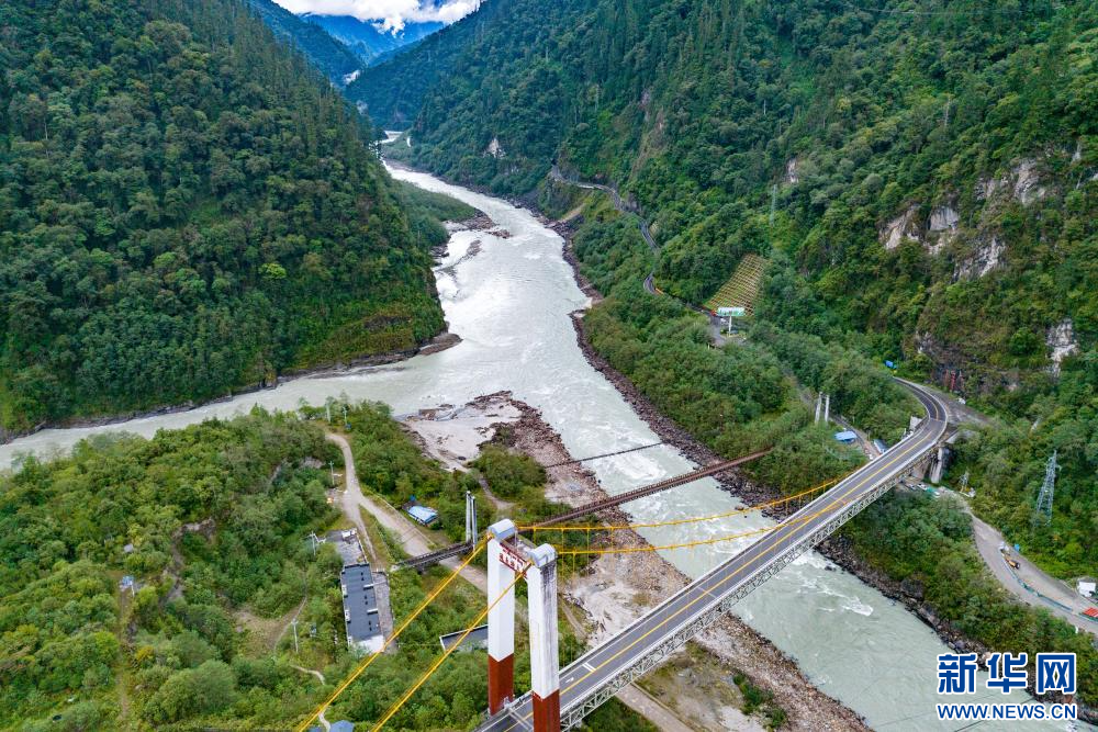 俯瞰通麥路段上的三座建于不同時期的橋(10月10日攝 無人機(jī)照片)。位于西藏林芝市波密縣境內(nèi)的川藏公路通麥路段,曾被稱為“通麥天險”。新華網(wǎng) 旦增努布 攝