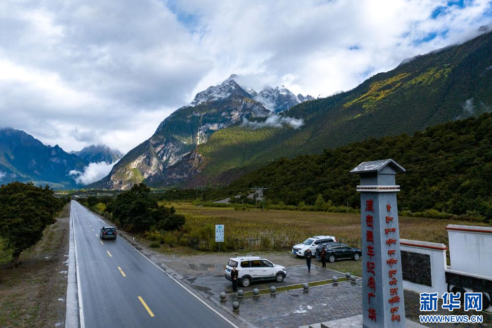 10月11日拍攝的波密通車紀(jì)念廣場(無人機(jī)照片)。2020年,西藏波密縣通過查閱文獻(xiàn)史料、比對老照片、咨詢當(dāng)?shù)乩先恕⑦h(yuǎn)程連線老一輩同志等方式,考證出當(dāng)時舉行通車典禮的地點(diǎn)為今波密縣松宗鎮(zhèn)角達(dá)村國道318旁。為紀(jì)念這一歷史事件,2021年4月波密縣在此處修建了波密通車紀(jì)念廣場。新華網(wǎng) 旦增努布 攝