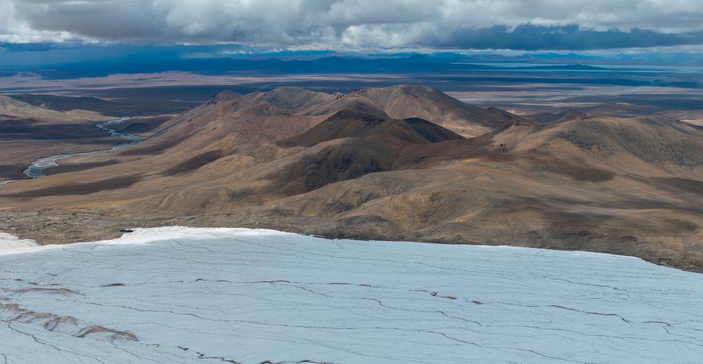 這是9月4日拍攝的普若崗日冰原8號(hào)冰川、消融形成的徑流以及遠(yuǎn)處的令戈錯(cuò)(無人機(jī)拼接照片)。新華社記者 姜帆 攝