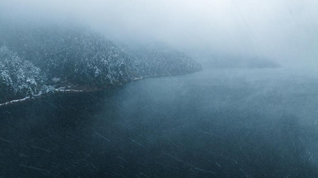 風(fēng)雪中的措木及日景區(qū)(無人機(jī)照片,10月20日攝)。措木及日位于西藏林芝市八一鎮(zhèn)市郊,是一座古冰磧湖。新華社記者 丁增尼達(dá) 攝