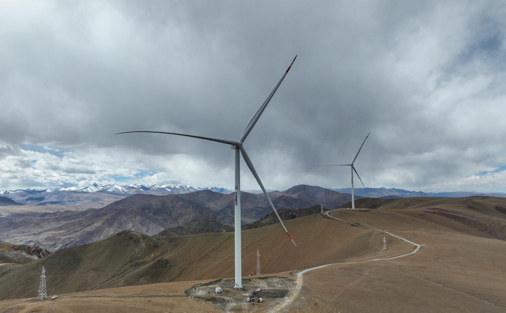 10月17日拍攝的位于西藏日喀則市薩迦縣的風(fēng)力發(fā)電機(jī)組(無人機(jī)照片)。新華社記者 晉美多吉 攝