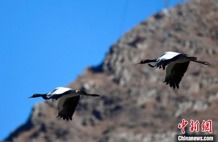 圖為11月3日,黑頸鶴在西藏拉薩達(dá)孜區(qū)上空飛翔。中新社記者 李林 攝