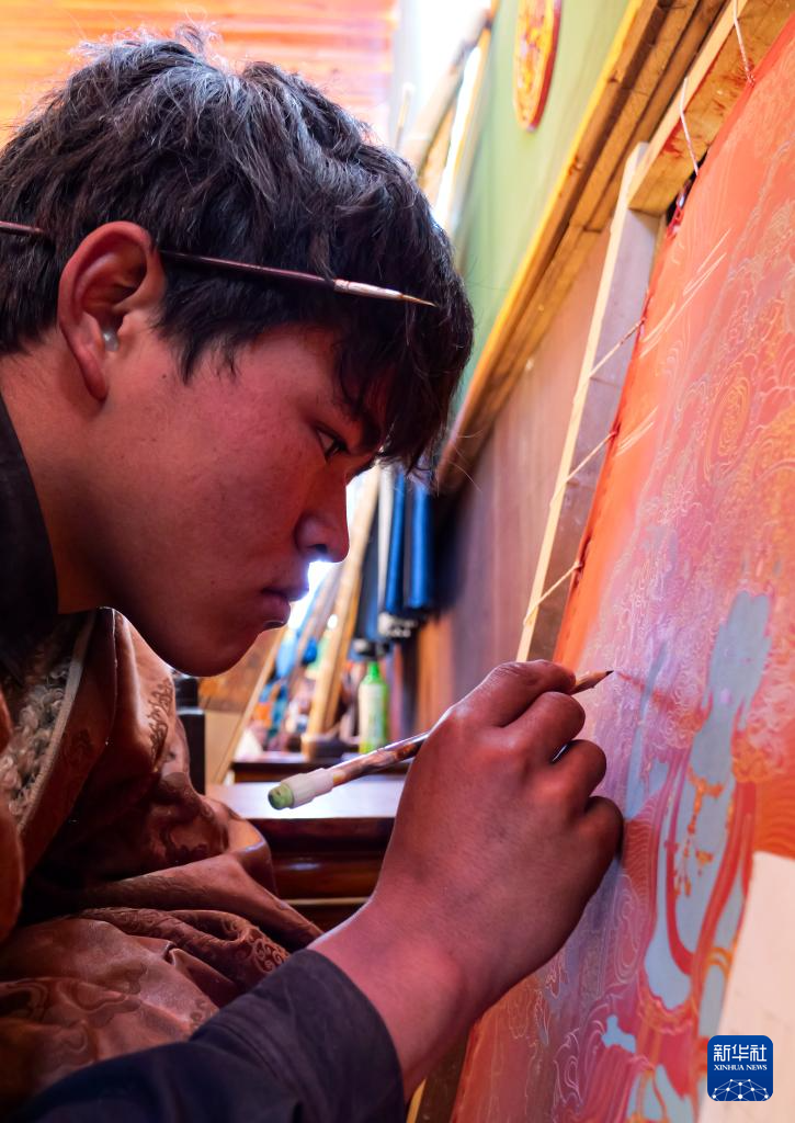 11月22日,昌都市丁青縣擁忠文化藝術(shù)中心非遺扶貧就業(yè)工坊學(xué)員在畫唐卡。新華社記者 楊帆 攝