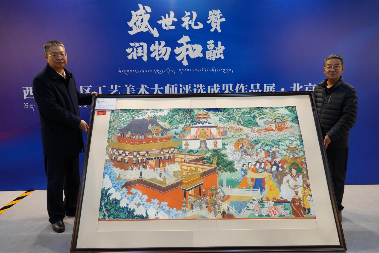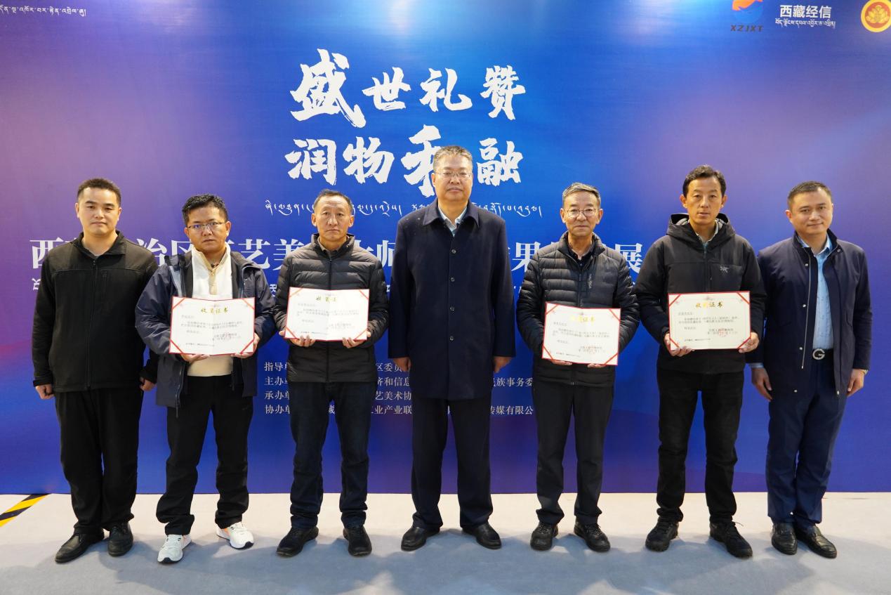 “西藏自治區(qū)工藝美術(shù)大師評(píng)選成果作品展”由西藏自治區(qū)經(jīng)濟(jì)和信息化廳、西藏自治區(qū)民族事務(wù)委員會(huì)聯(lián)合主辦,于2024年11月7日在民族文化宮展出。本次捐贈(zèng)作品為“西藏自治區(qū)工藝美術(shù)大師評(píng)選成果作品展”中的5件代表性精品力作,包括唐卡作品《格薩爾王》(復(fù)制件)(作者:貢覺杰)、《文成公主建小昭寺》(復(fù)制件)(作者:羅布斯達(dá))、《一枝一葉總關(guān)情》(復(fù)制件)(作者:珠木巧),堆繡作品《金絲野牦?!罚ㄗ髡?晉美洛追)、《石榴籽》(作者:晉美洛追)。任毅同志向作者頒發(fā)了收藏證書,并表示誠(chéng)摯感謝。