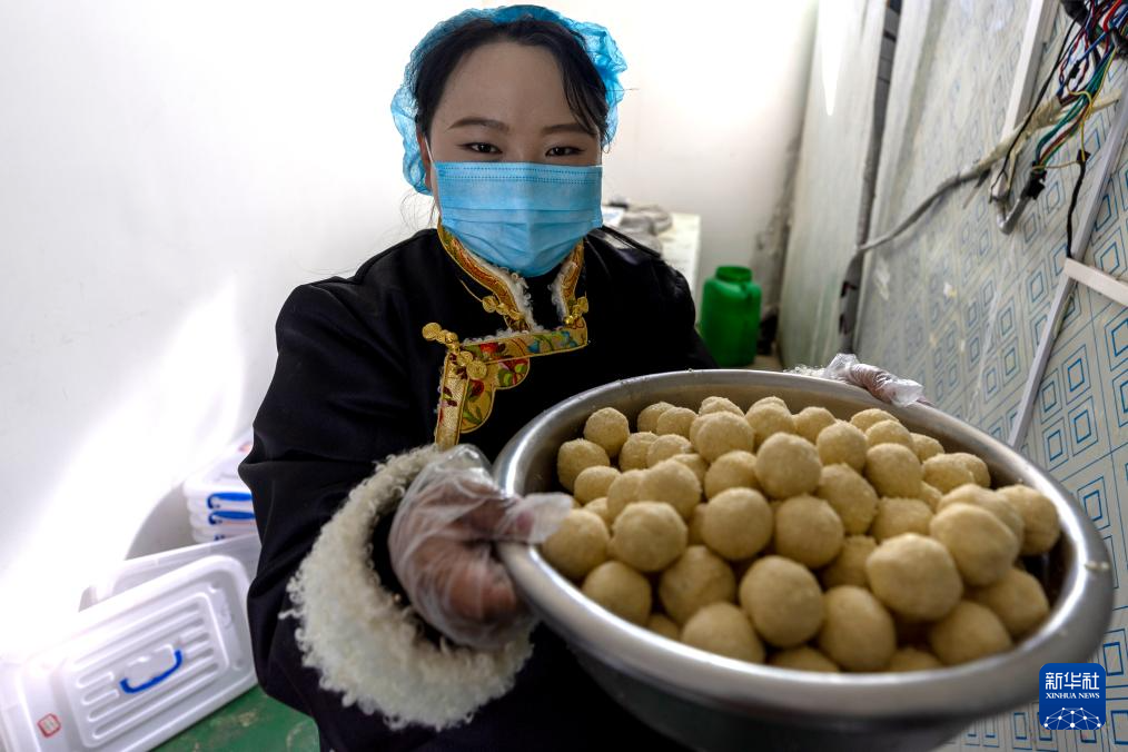 11月28日,在基地就業(yè)的當?shù)貑T工索朗卓瑪在用傳統(tǒng)工藝制作奶渣。新華社記者 姜帆 攝