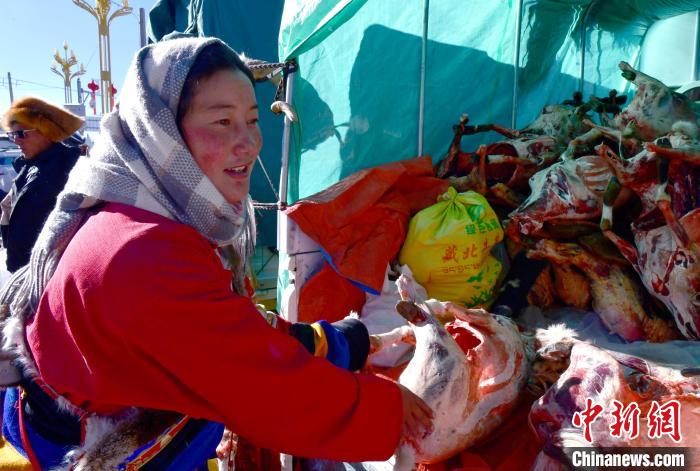 12月6日,西藏自治區(qū)那曲市申扎縣第十八屆畜產(chǎn)品展銷會現(xiàn)場,牧民整理售賣的羊肉?!±盍?攝