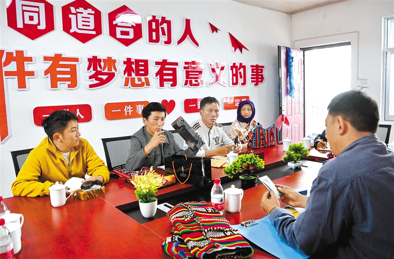 那曲市安多縣的大學(xué)畢業(yè)生倉秋多吉聯(lián)合6人創(chuàng)業(yè),于2021年創(chuàng)辦了安多托尕爾倉游牧產(chǎn)業(yè)有限責(zé)任公司。公司搭建了民族手工藝產(chǎn)品、土特產(chǎn)銷售平臺,在當(dāng)?shù)卣畠?yōu)化營商環(huán)境政策的支持下,創(chuàng)業(yè)團(tuán)隊逐步擴(kuò)大,帶動了當(dāng)?shù)剞r(nóng)牧民產(chǎn)業(yè)興旺?!D為倉秋多吉(左二)和團(tuán)隊核心成員商討產(chǎn)品銷售提升策略。(資料圖片) 新華社記者 張汝鋒 攝