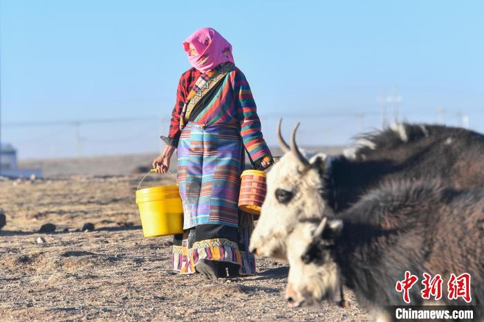 12月12日,西藏自治區(qū)那曲市安多縣帕那鎮(zhèn)牧民土巴卓瑪準(zhǔn)備去擠牦牛奶。中新社記者 貢嘎來松 攝