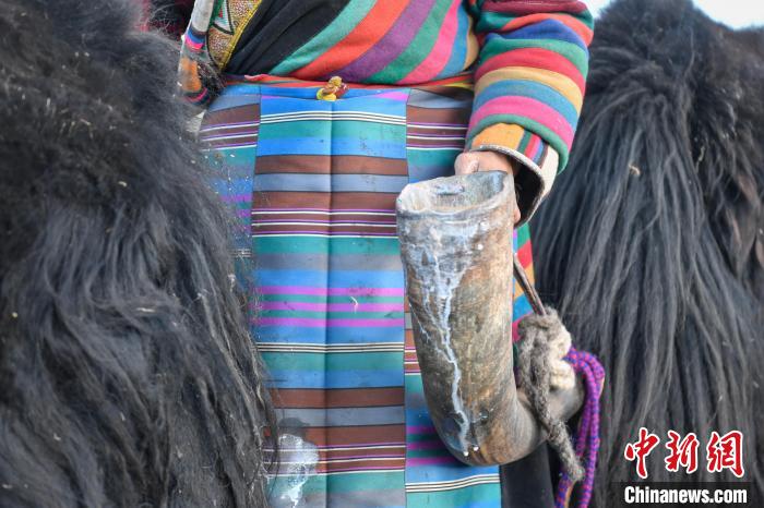 12月12日,西藏自治區(qū)那曲市安多縣帕那鎮(zhèn)牧民土巴卓瑪正準(zhǔn)備擠牦牛奶。中新社記者 貢嘎來松 攝
