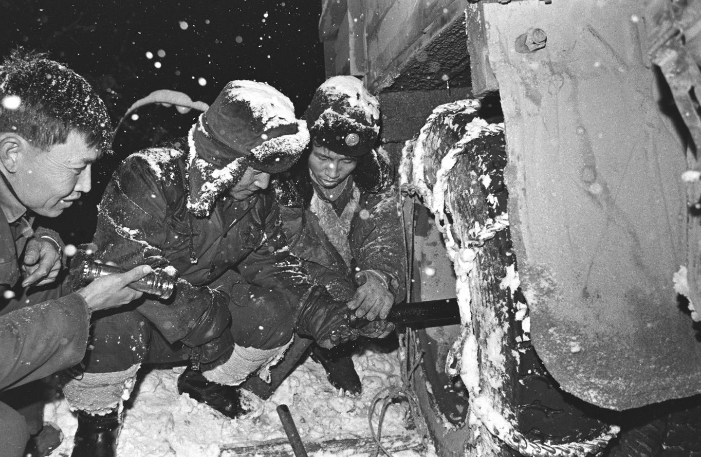 1985年3月中旬的一場(chǎng)罕見(jiàn)大雪中,川藏公路二郎山交通安全管理小組成員連夜搶修滿載援藏物資的運(yùn)輸車輛。